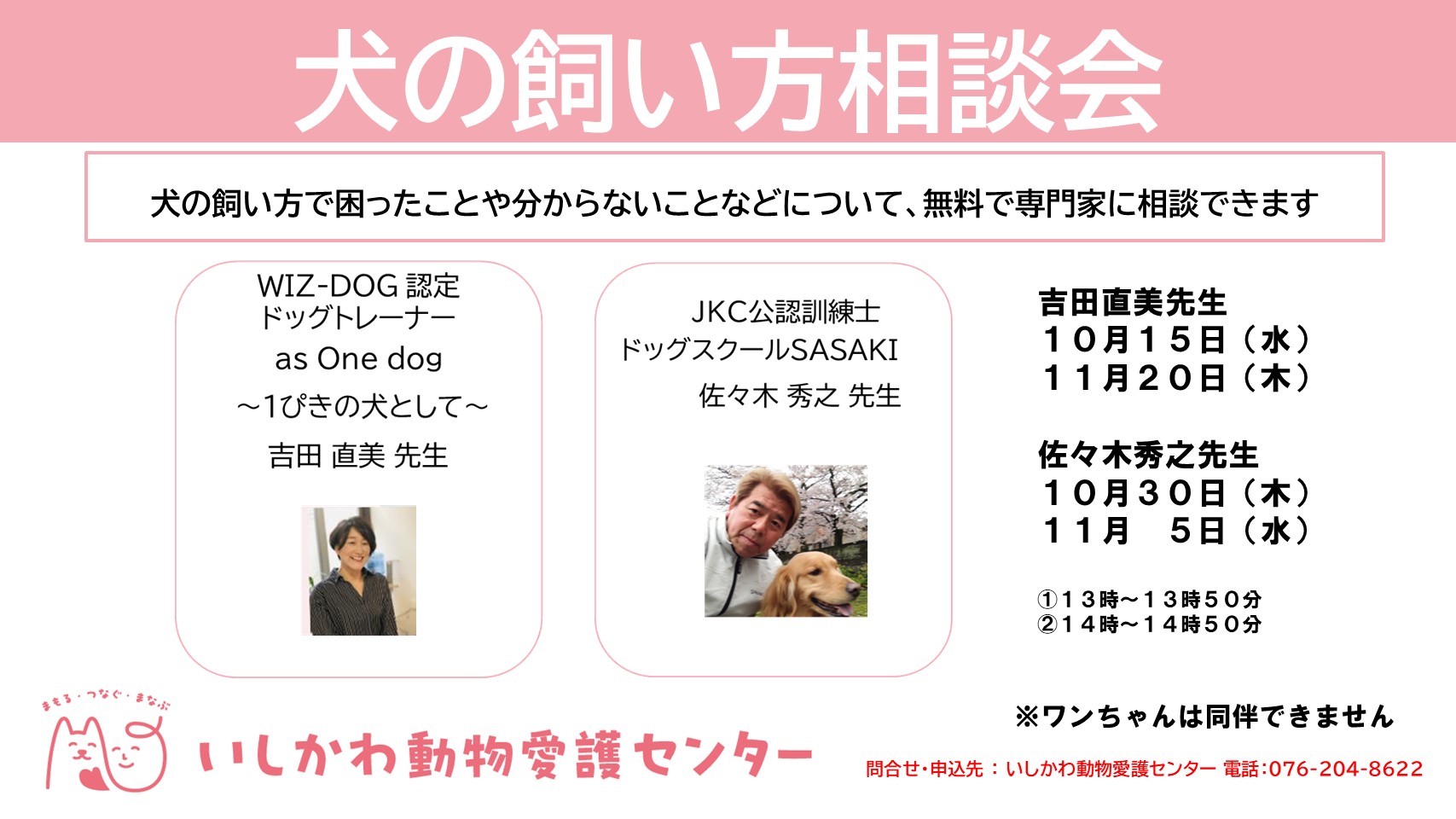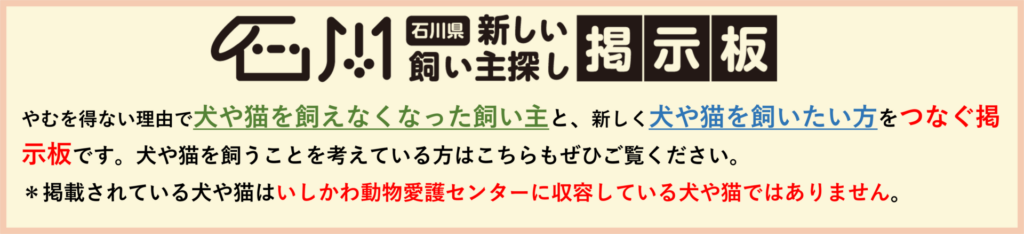 お知らせ 2025年10月11日 イベント お知らせ いしかわ動物愛護センター ハロウィンイベントについて 2025年9月30日 お知らせ 取組紹介 【10月】犬の飼い方相談会にご参加ください 2025年9月19日 お知らせ 令和7年度小学校動物愛護絵画の展示について 2025年9月19日 イベント お知らせ はじめませんか? 地域でのら猫対策セミナーの開催について 2025年9月17日 お知らせ 取組紹介 石川県 新しい飼い主探し掲示板について 2025年9月3日 イベント お知らせ 猫とのふれあいイベントについて お知らせをもっと見る 飼い主さん募集中 すべて 譲渡対象の犬猫をもっと見る 迷子の犬猫 迷子の犬猫をもっと見る