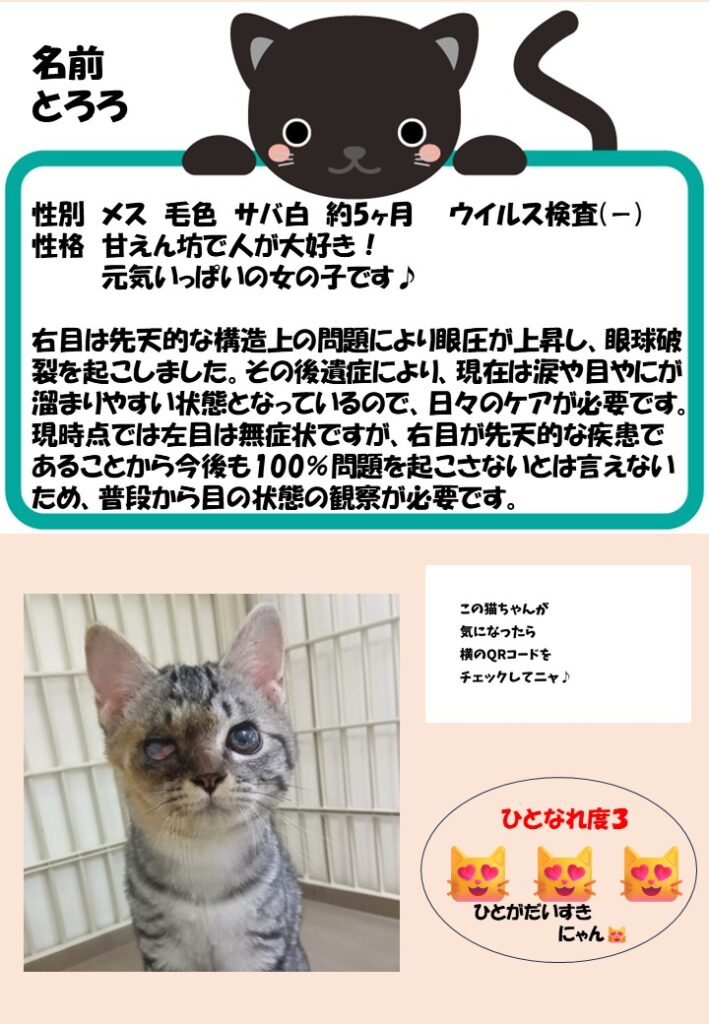 センターには、気が強いとか、病気などによって飼養が難しいために、他の譲渡対象の猫に比べて収容期間が長くなってしまう猫がいます。そういった猫たちであっても、新しい飼い主になってくださる人をセンターでは探しています。