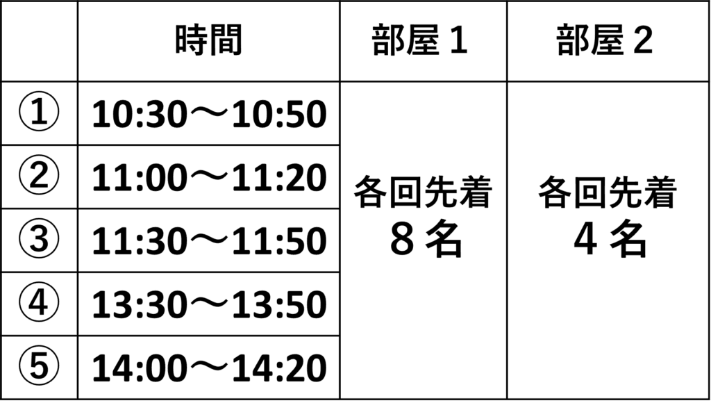 ①11:00~11:30 ②11:30~12:00 ③13:00~13:30 ④13:30~14:00