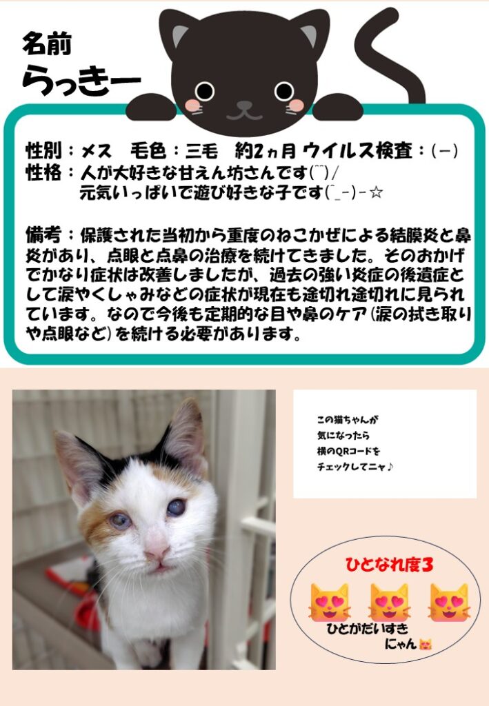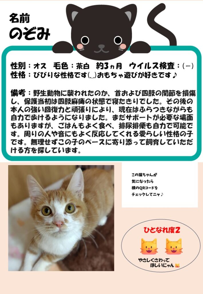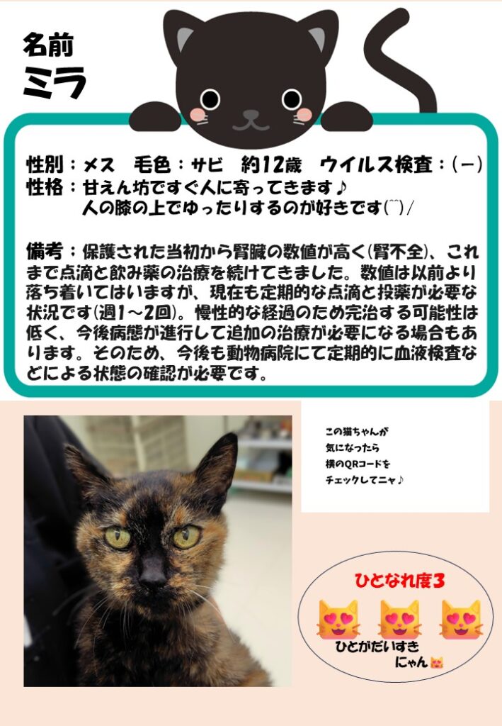 センターには、気が強いとか、病気などによって飼養が難しいために、他の譲渡対象の猫に比べて収容期間が長くなってしまう猫がいます。そういった猫たちであっても、新しい飼い主になってくださる人をセンターでは探しています。