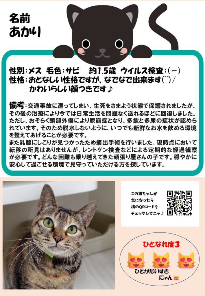 センターには、気が強いとか、病気などによって飼養が難しいために、他の譲渡対象の猫に比べて収容期間が長くなってしまう猫がいます。そういった猫たちであっても、新しい飼い主になってくださる人をセンターでは探しています。